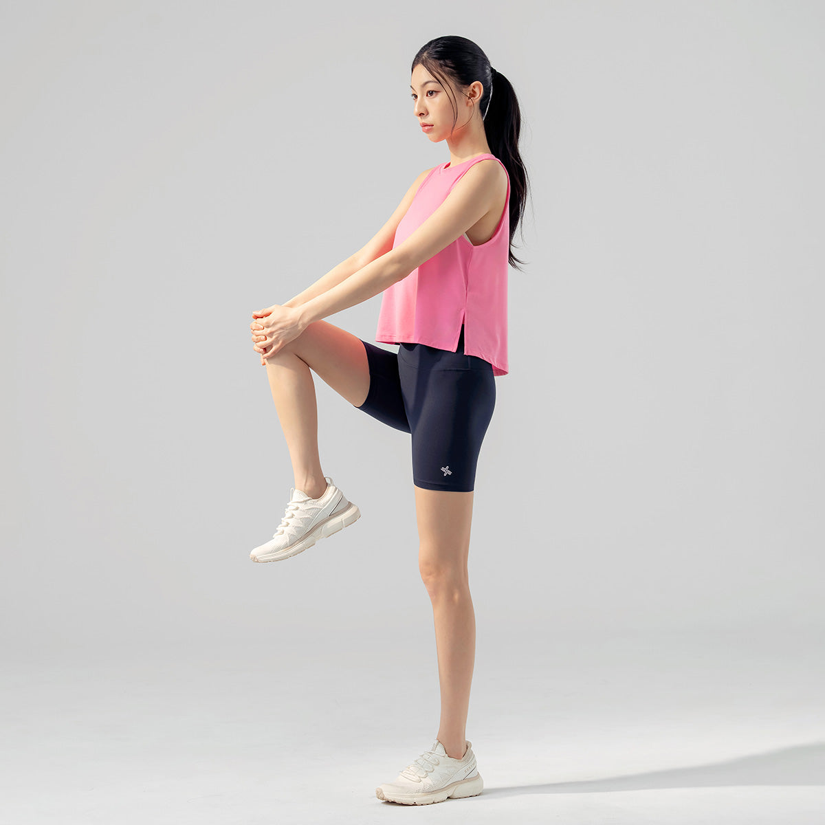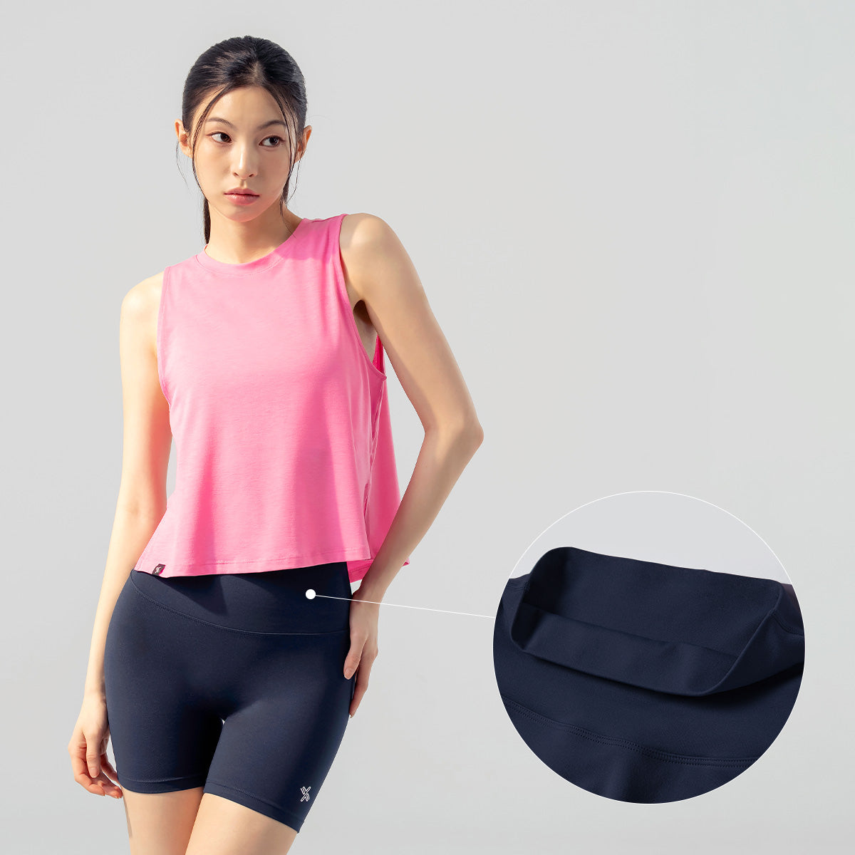 The waistband has no sewing lines with an inserted power-net mesh band to support your body. It makes you feel comfortable during sports focused on your belly.