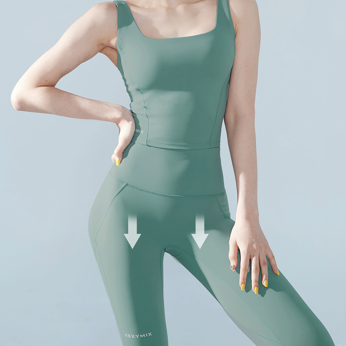 Crossed X-shaped seams support leg muscles, reducing fatigue and enhancing workout efficiency.