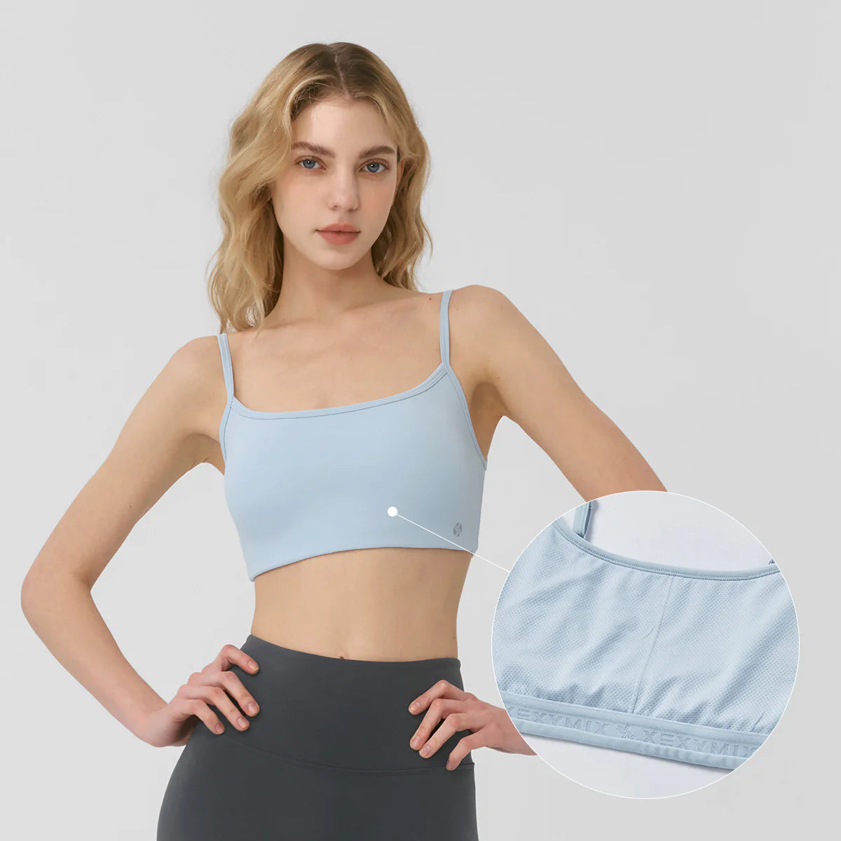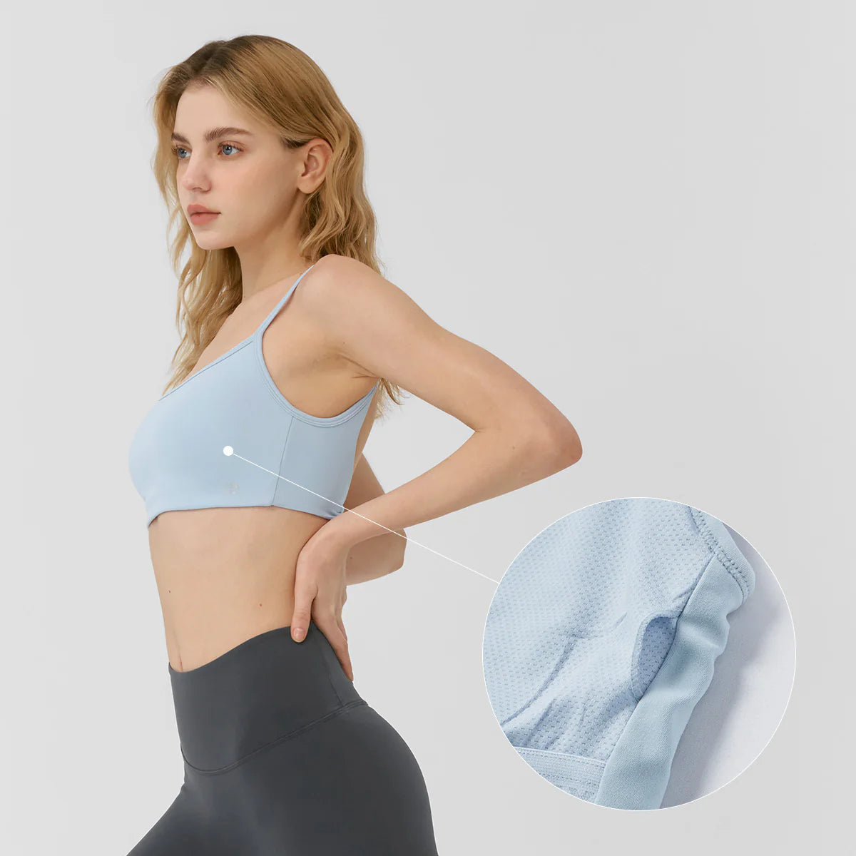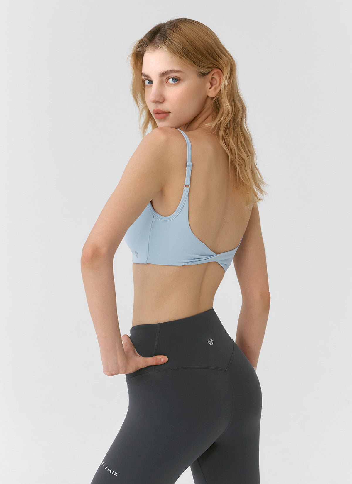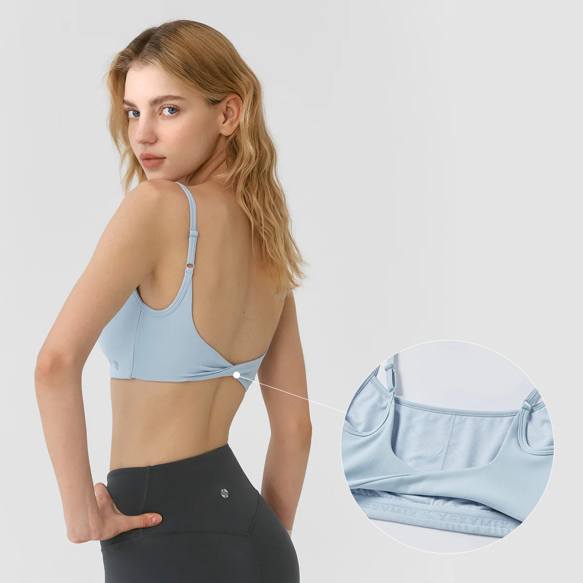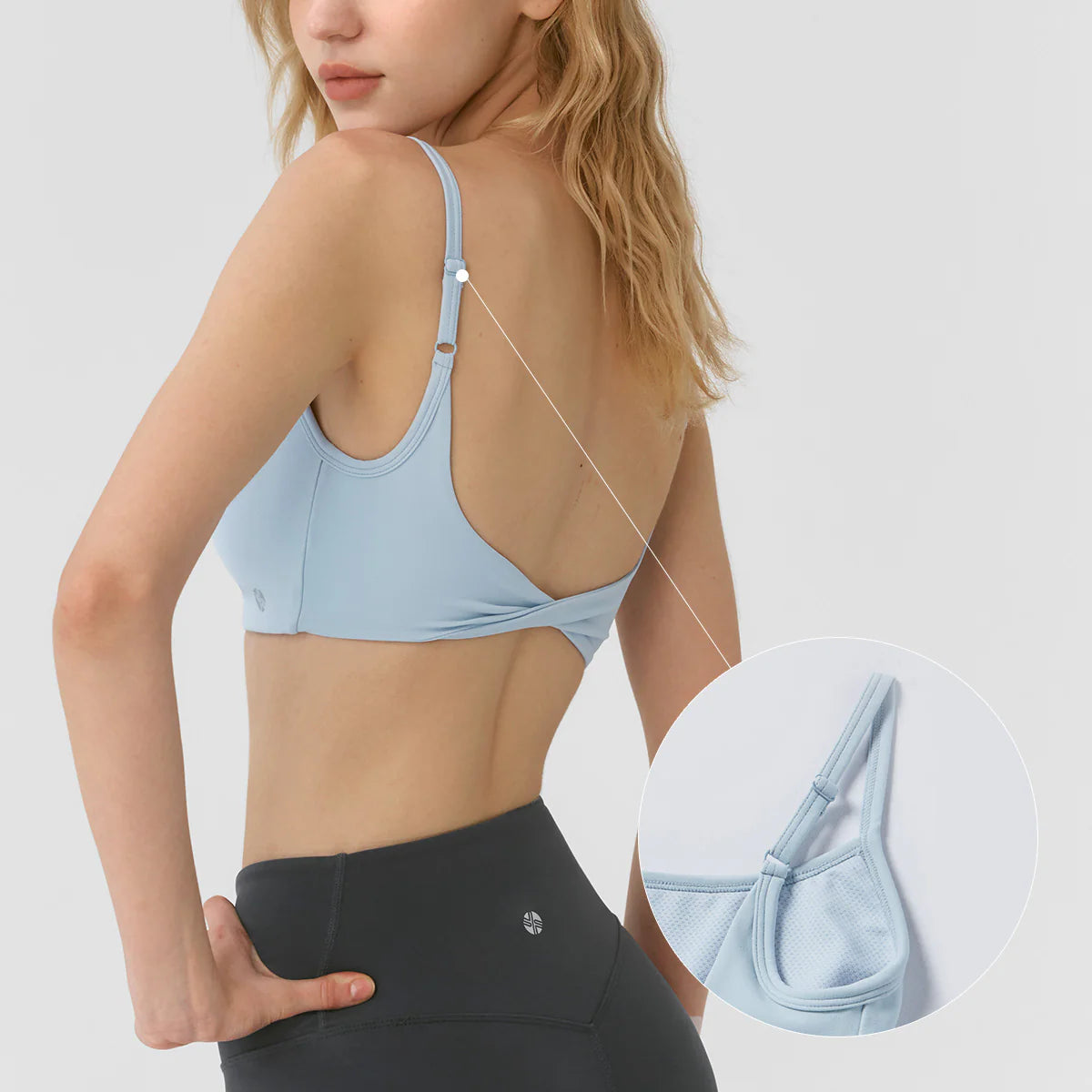 The deep-cut backline enhances shoulder blade mobility, allowing easy observation of back muscle movement during workouts, while the twisted design adds a feminine touch.