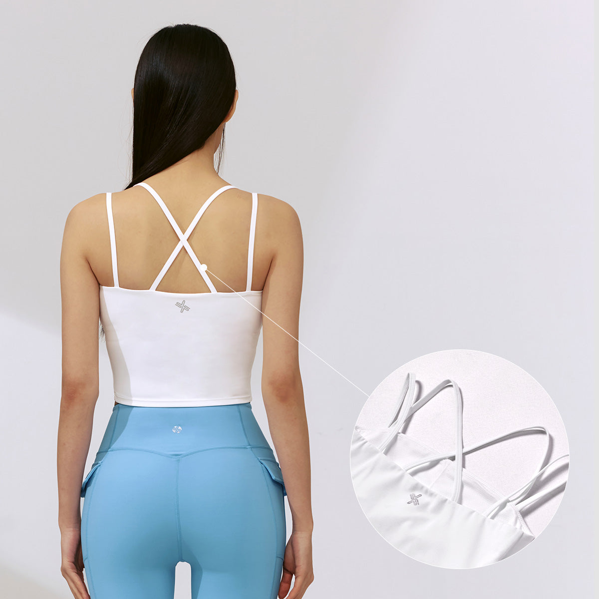 The X-shaped cross design along the backline follows the shoulder line, preventing slipping and ensuring a secure, comfortable fit.