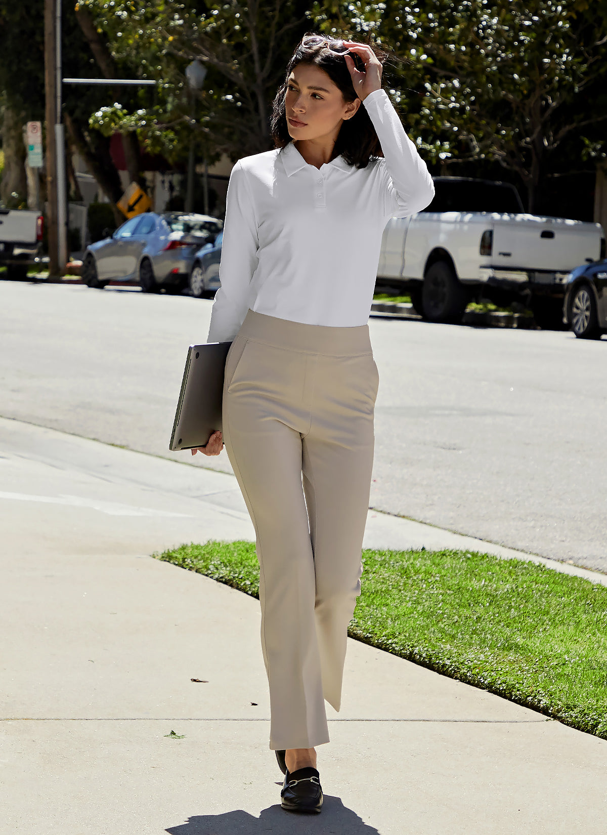 The clean polo collar design creates a classic mood. The inside of the neckline is finished with logo tape to minimize stretching.