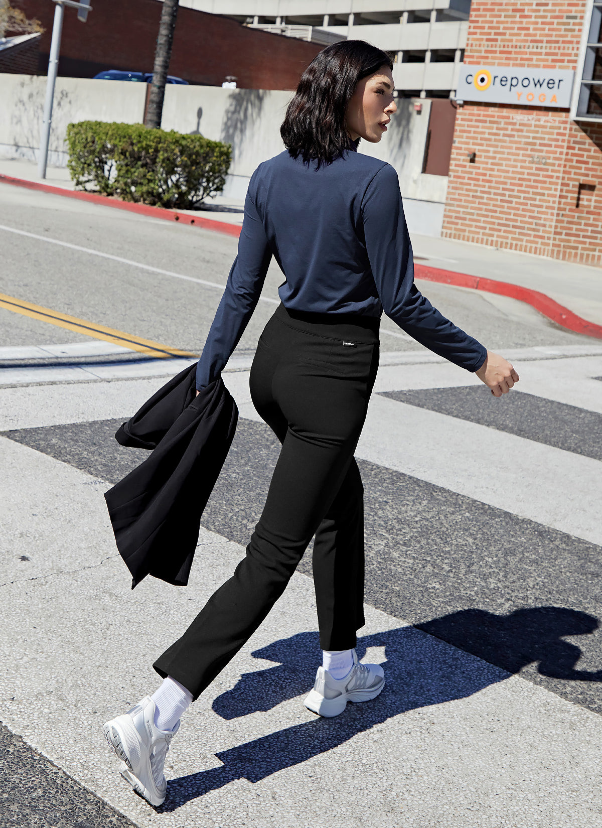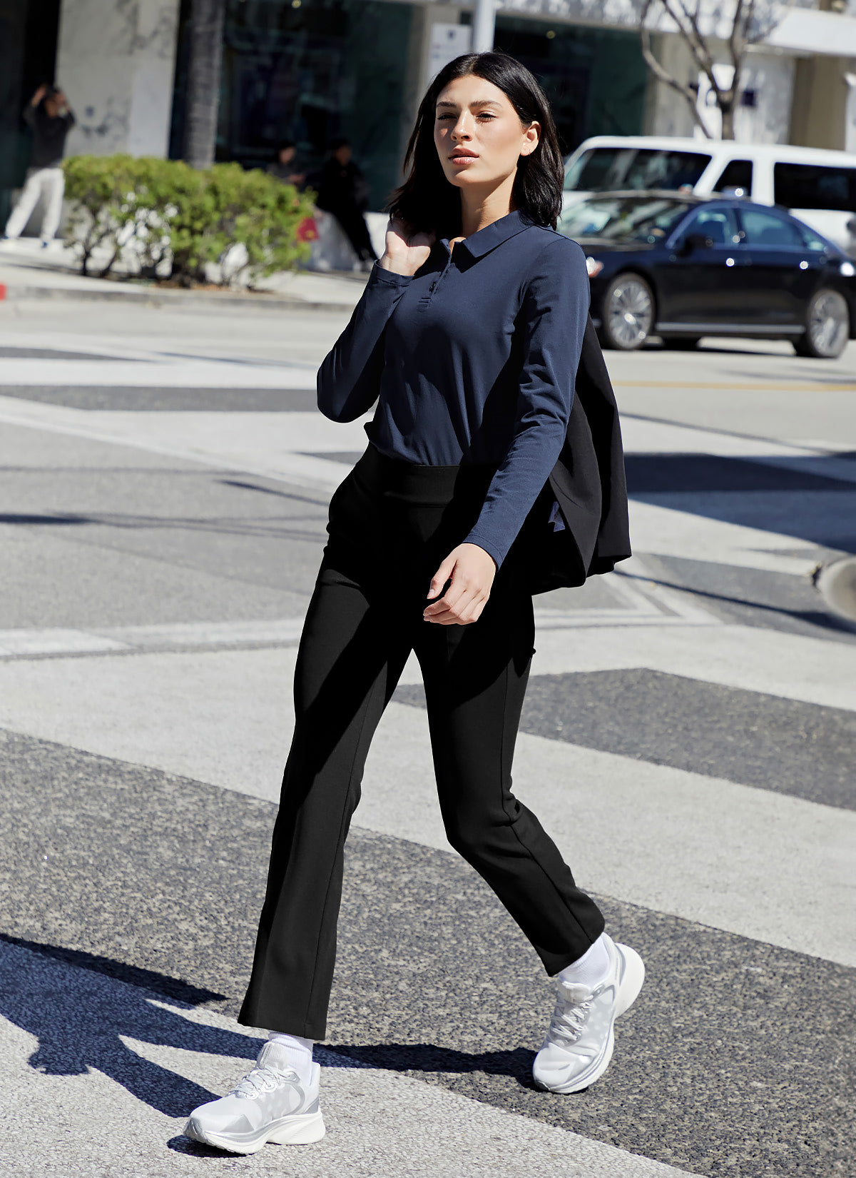 The hem is designed in a natural round shape with shorter sides, providing a visual correction effect that makes the waist line look slimmer.