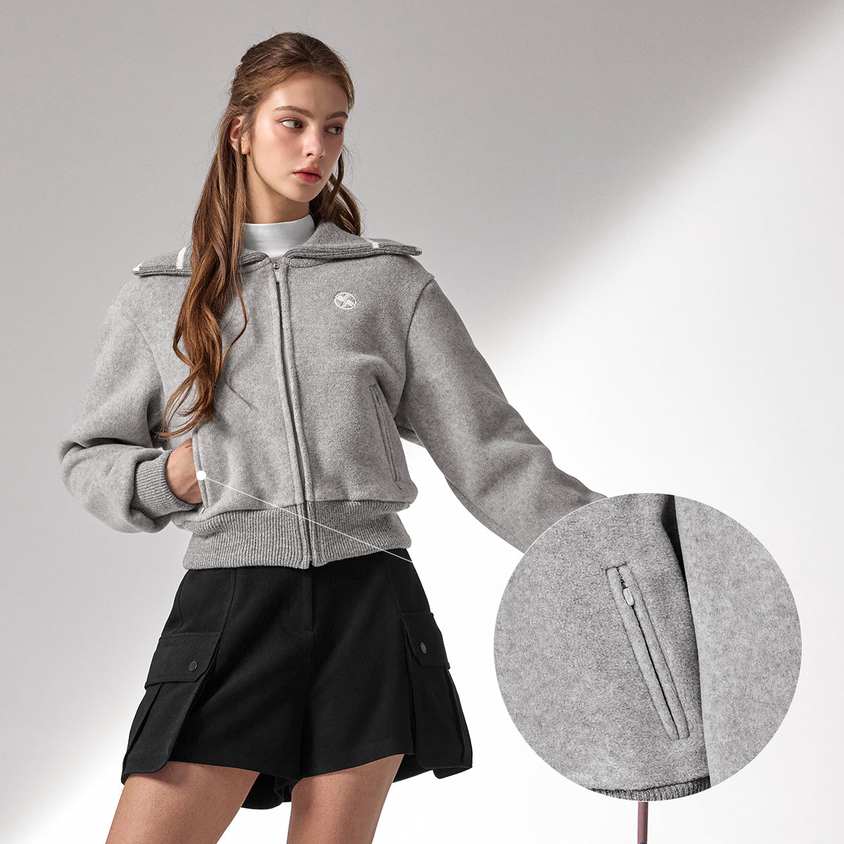 A wide, softly structured knit collar gently wraps the neck, delivering enhanced warmth and comfort.