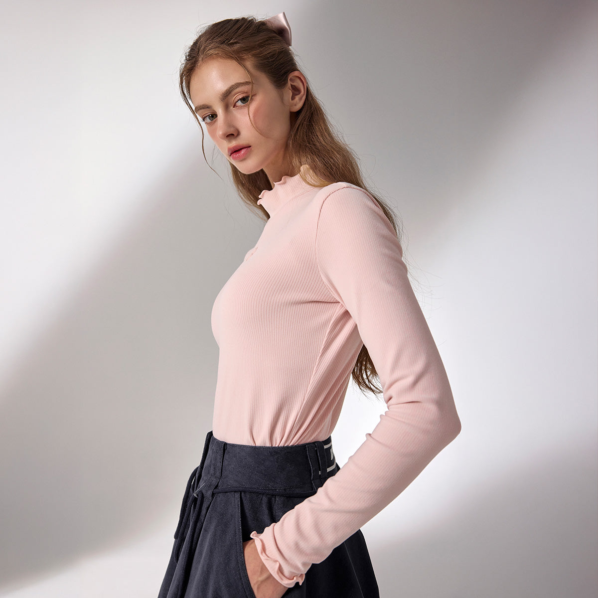 The mock neck gently wraps around the neck to keep you warm during transitional seasons, with added inner taping to help prevent shape distortion.