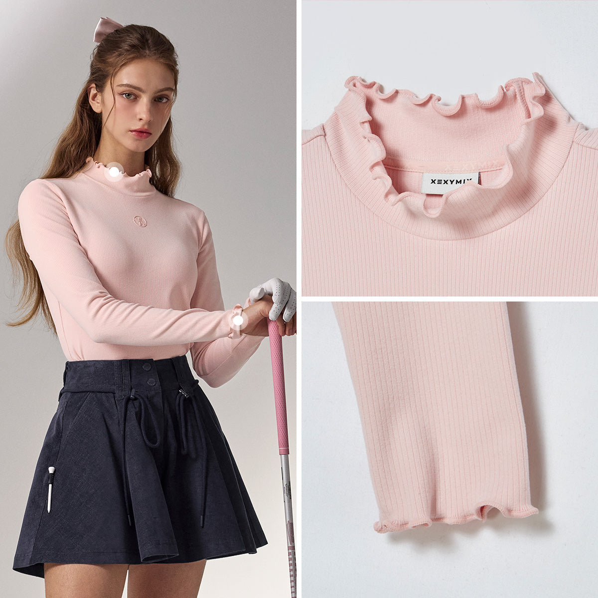 Ruffle point along the neckline and cuffs add a stylish focal point, enhancing a soft, feminine mood.