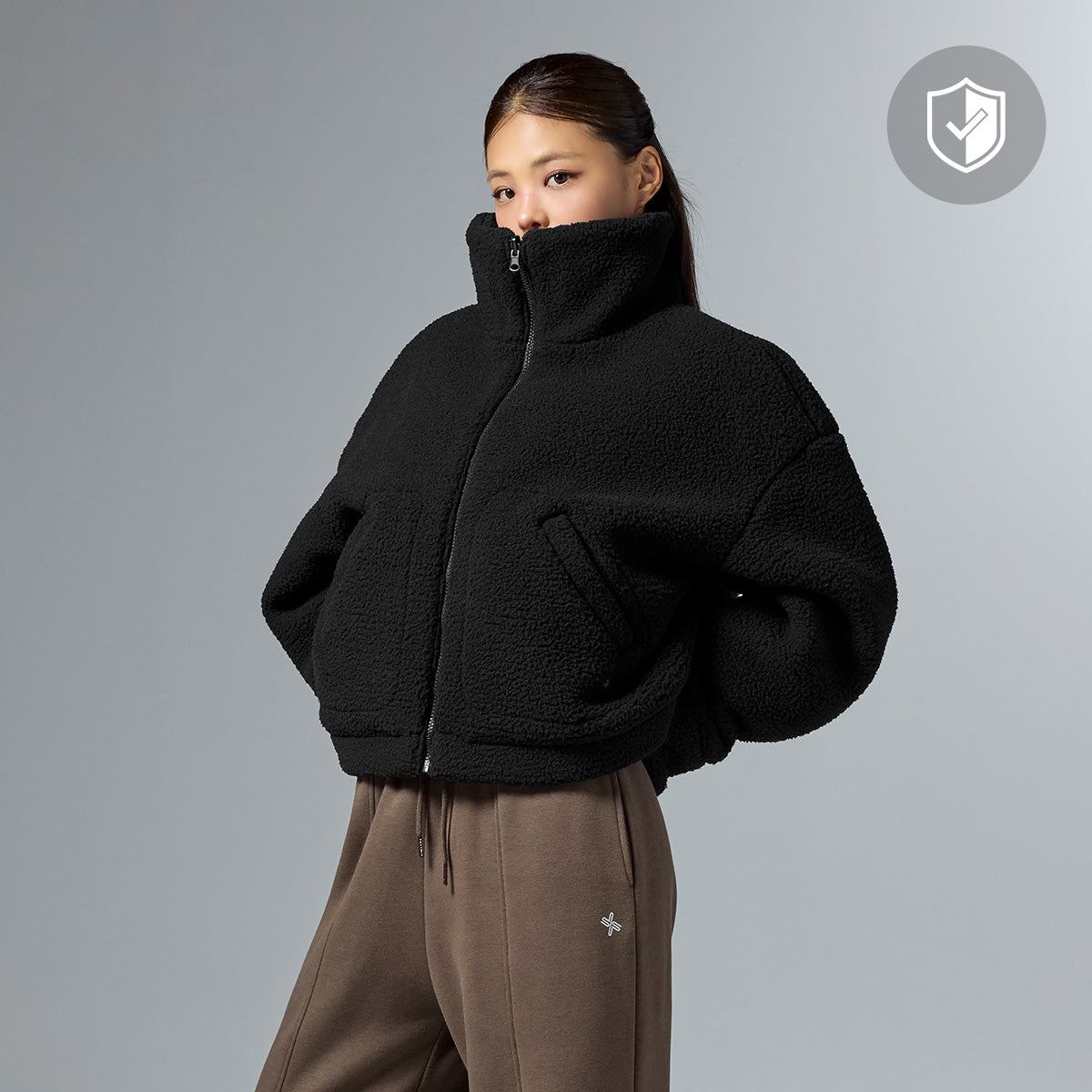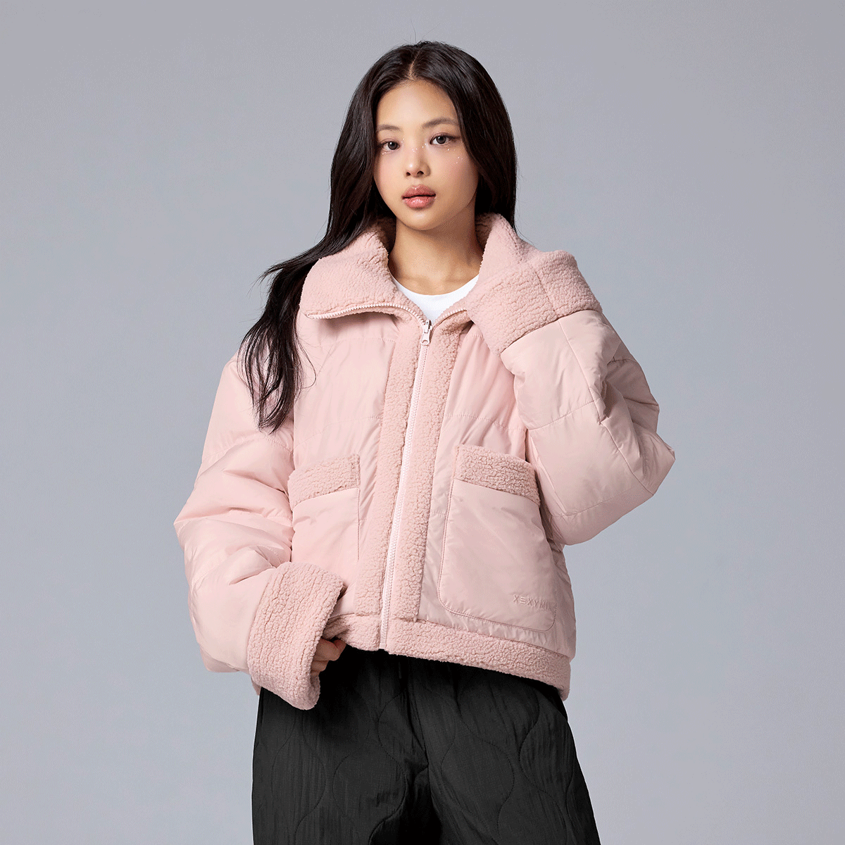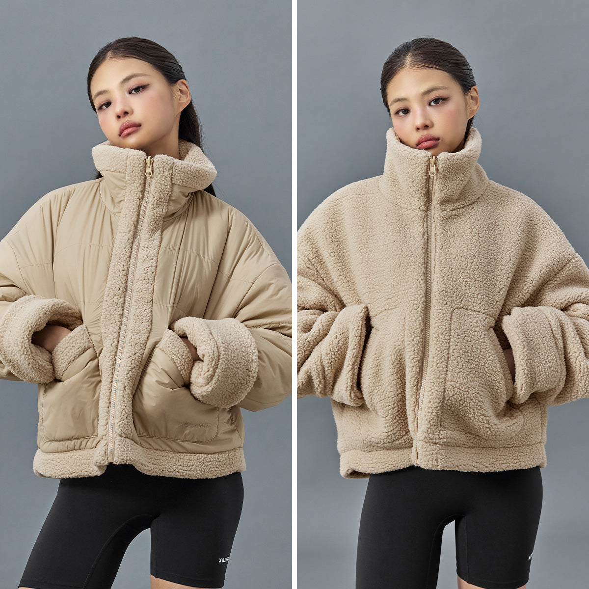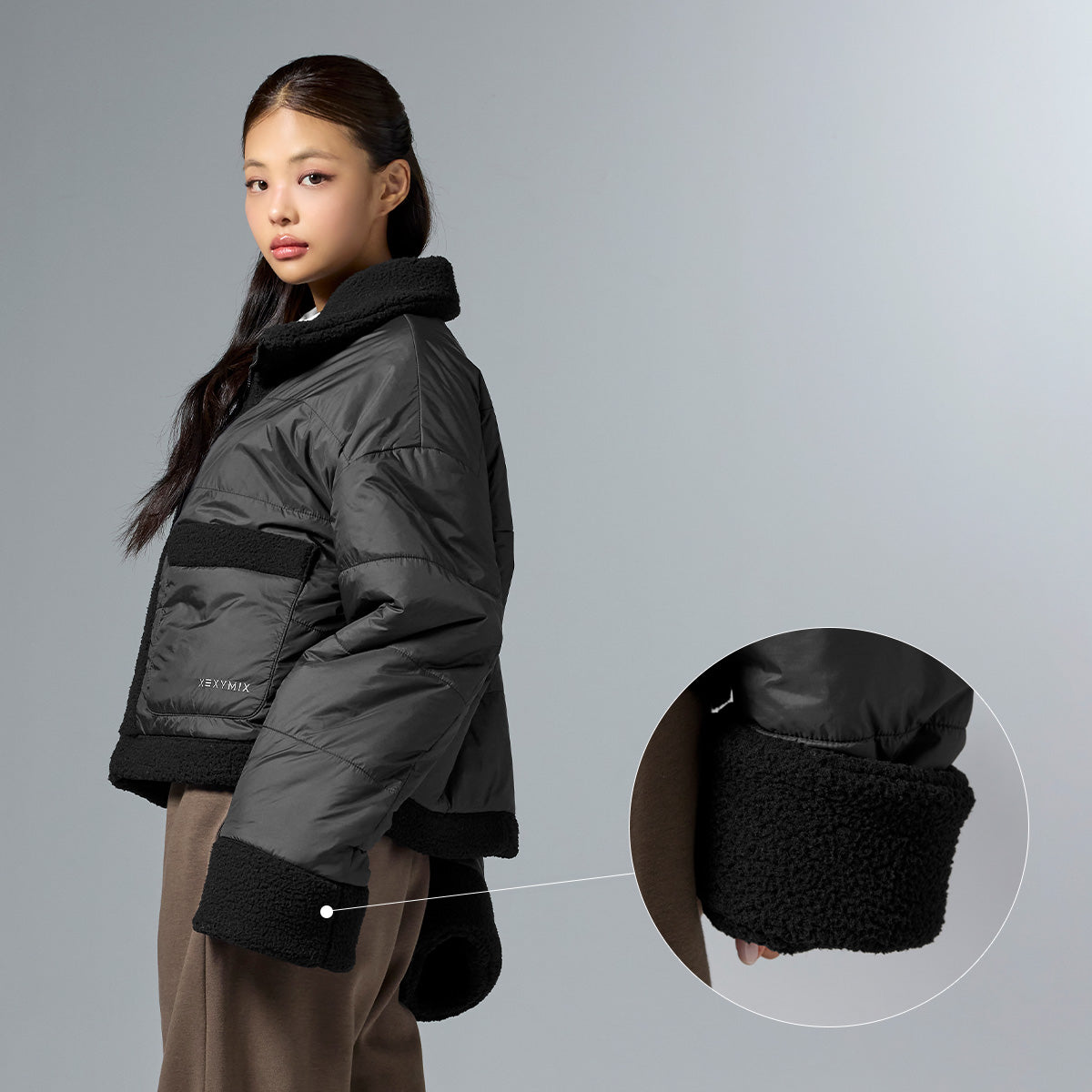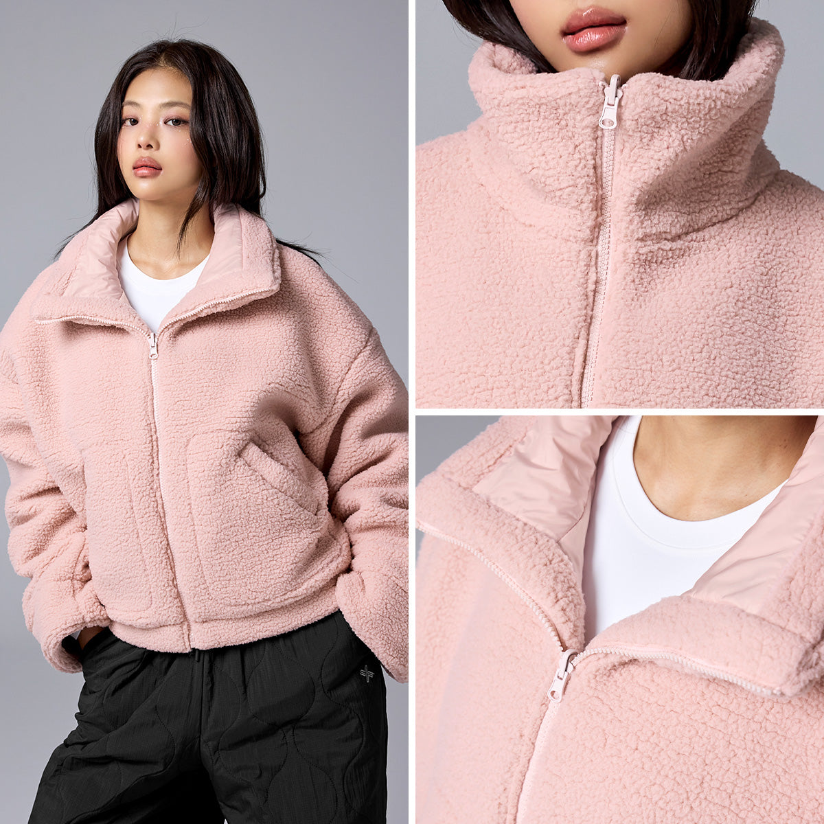 Sherpa fabric is applied to the upper neck, front placket, hem, cuffs, and pocket openings, adding a stylish mixed-material point.
