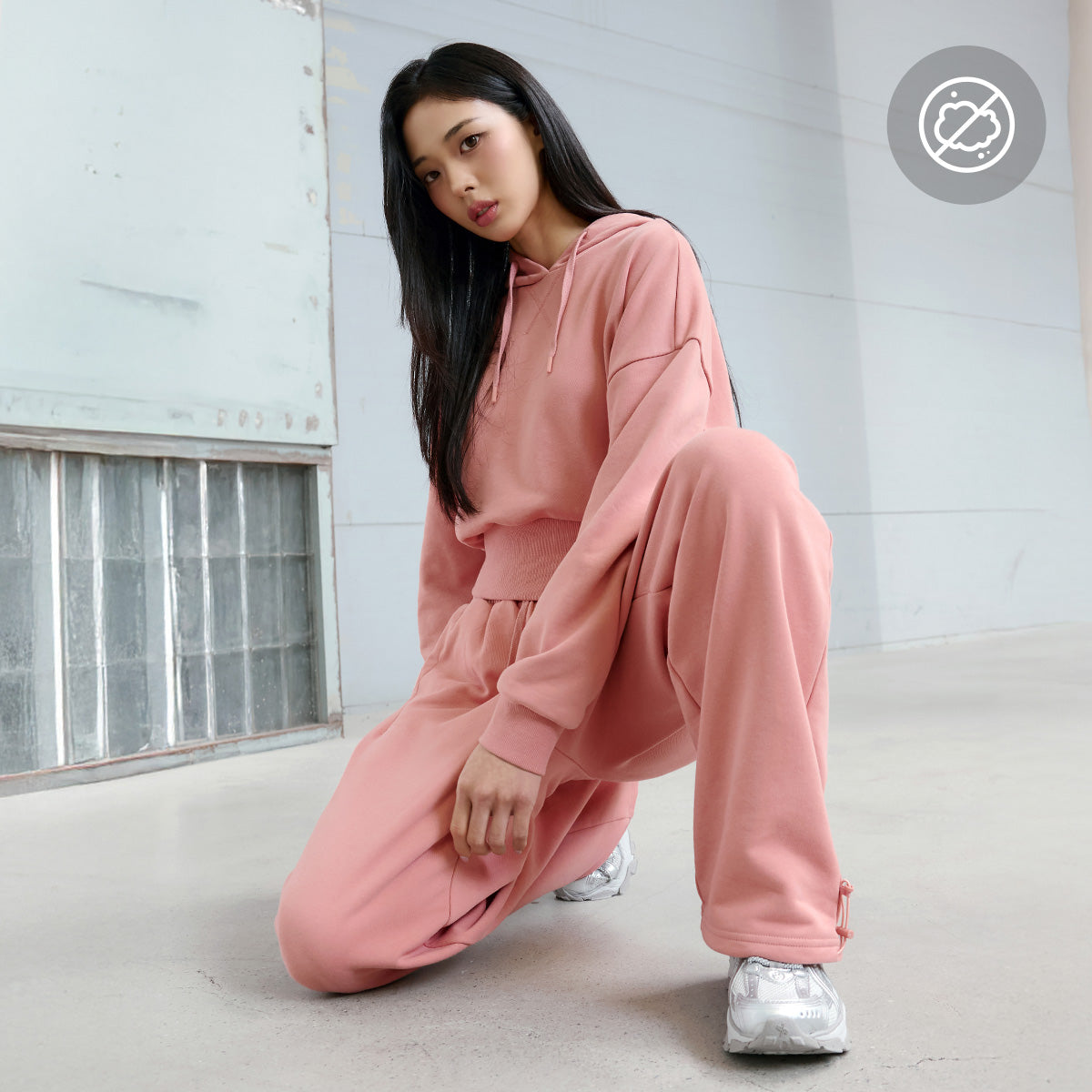 The fabric undergoes enzyme washing, a process that removes fine surface fibers using natural enzymes, minimizing pilling and giving the material an extra-soft finish.