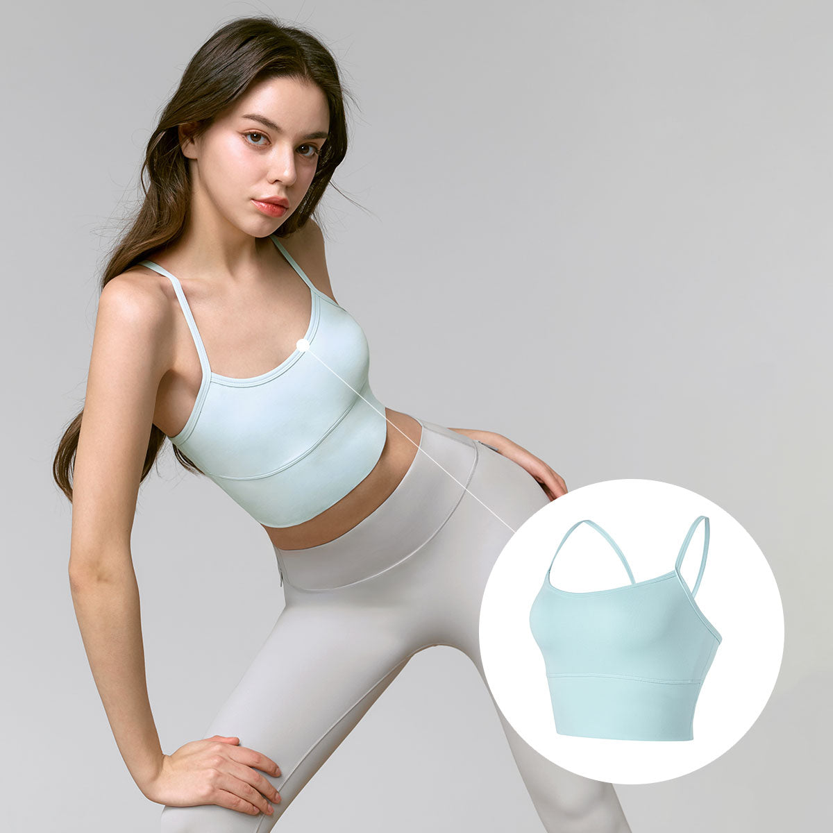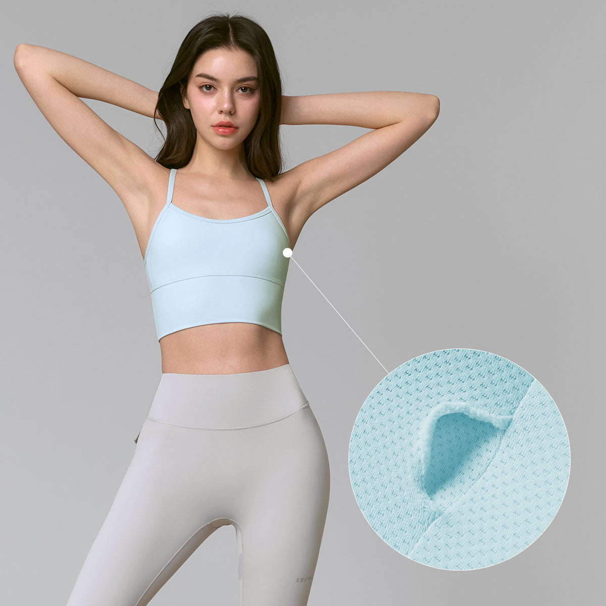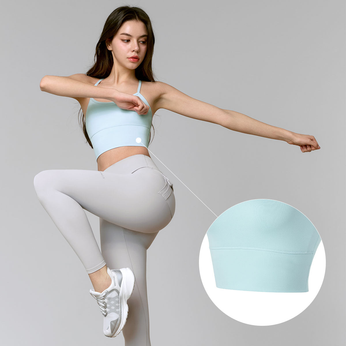 The tight band under the chest line and the wide hem of the fabric hold the waist steady so that it doesn't go up during arm-raising movements.
