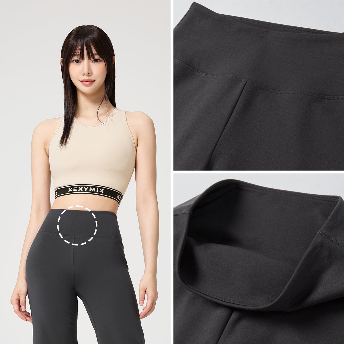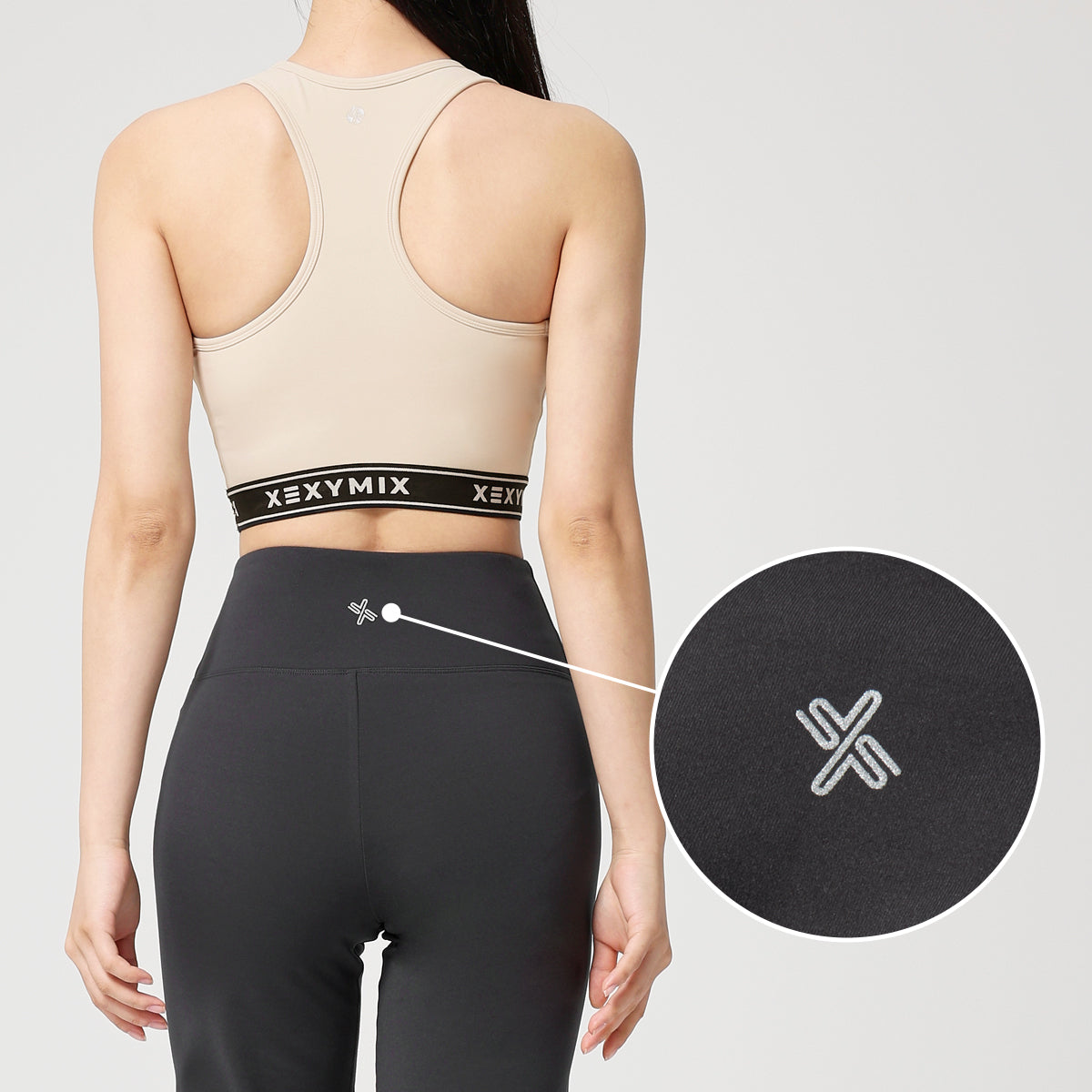 The XEXYMIX symbol logo is placed at the center of the back waistband, adding a clean, understated touch that highlights the brand’s identity.