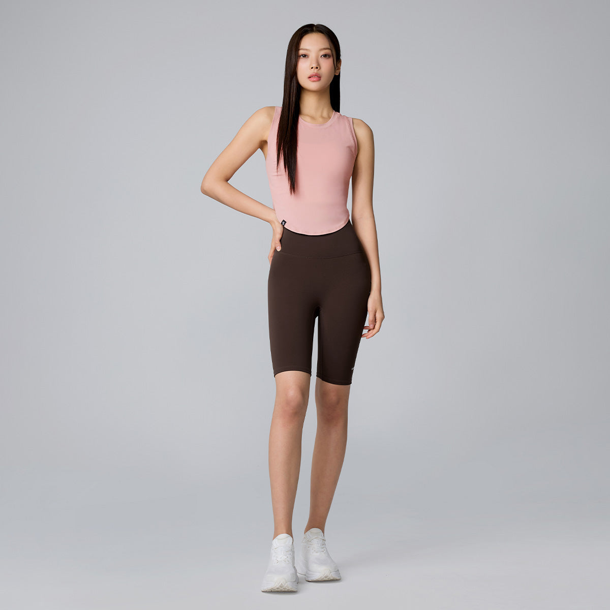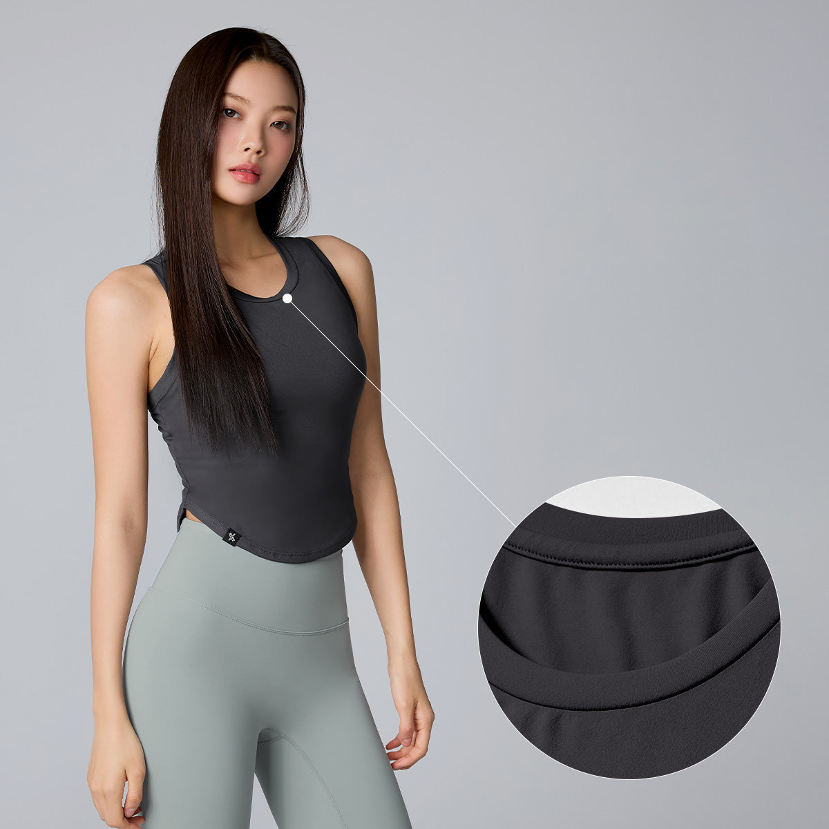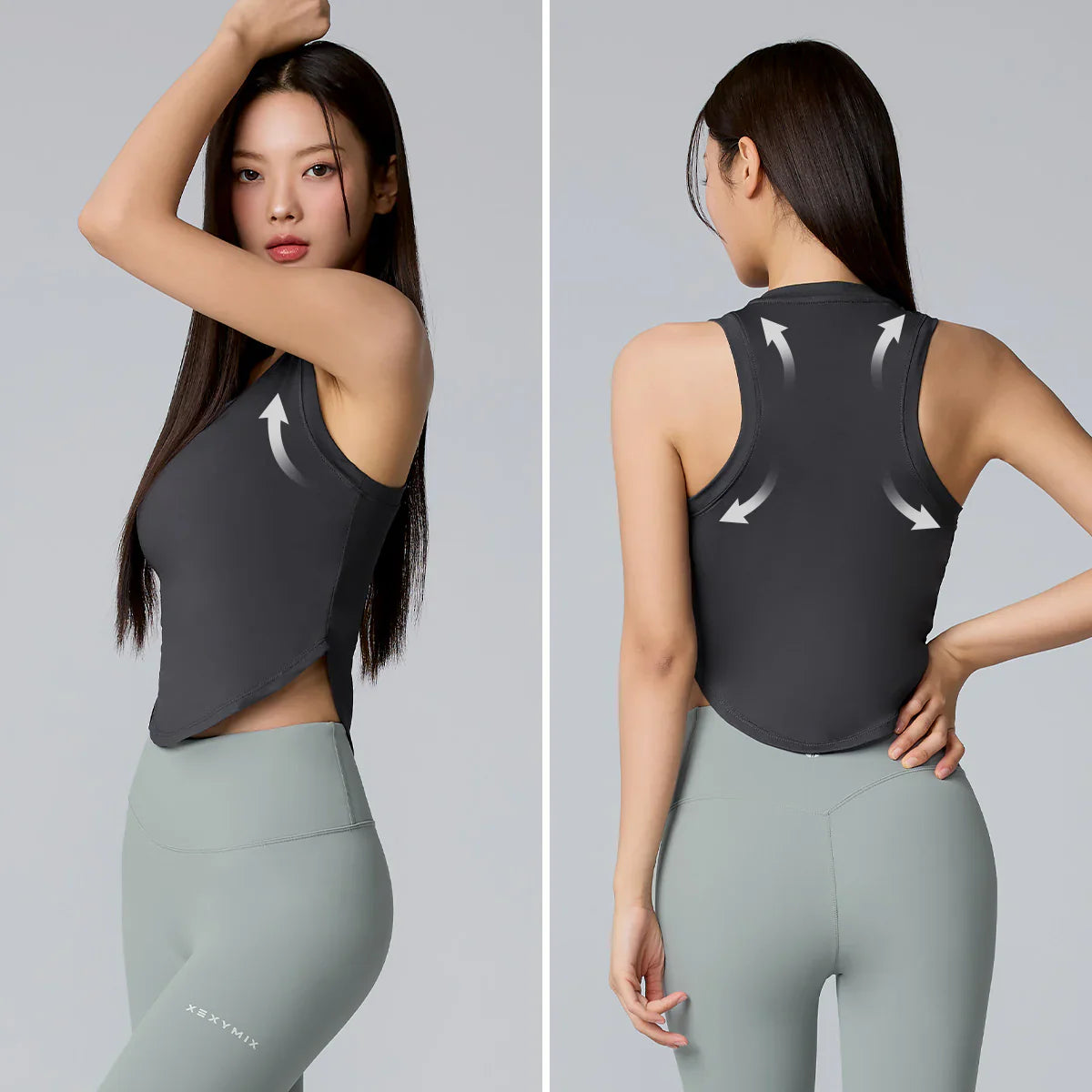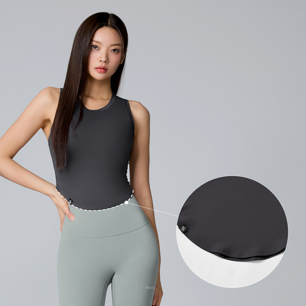 The hem is shaped with a subtle curve and shorter sides, creating a slimming effect on the waistline.